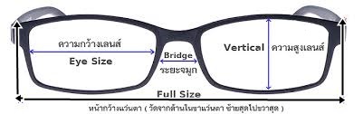 1. ความกว้างเลนส์ ( Eye Size ) : ระยะเลนส์ซ้ายสุดไปขวาสุด ไม่รวมกรอบแว่นตา 2. ระยะจมูก ( Bridge ) : ระยะระหว่างเลนส์ ซ้าย และ ขวา 3. ความสูงเลนส์ ( Vertical ) : ความสูงของเลนส์สายตา ไม่รวมกรอบแว่นตา 4. หน้ากว้างแว่นตา ( Full Size ) : ขนาดหน้ากว้างแว่นตา วัดจากขาแว่นตาด้านในตรงข้อพับ ซ้ายไปขวา 5. ความยาวขาแว่นตา ( Temple ) : ความยาวขาแว่นตาวัดแนวตรง |